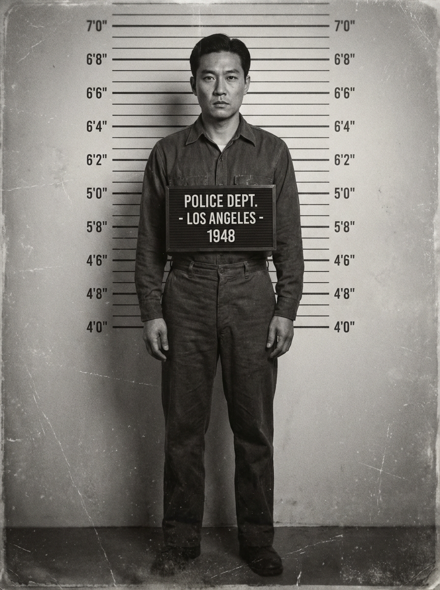 model in vintage style mugshot, black and white aesthetic, old fashioned booking photo, serious demeanor