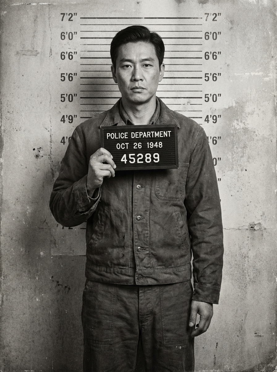 model in vintage style mugshot, black and white aesthetic, old fashioned booking photo, serious demeanor