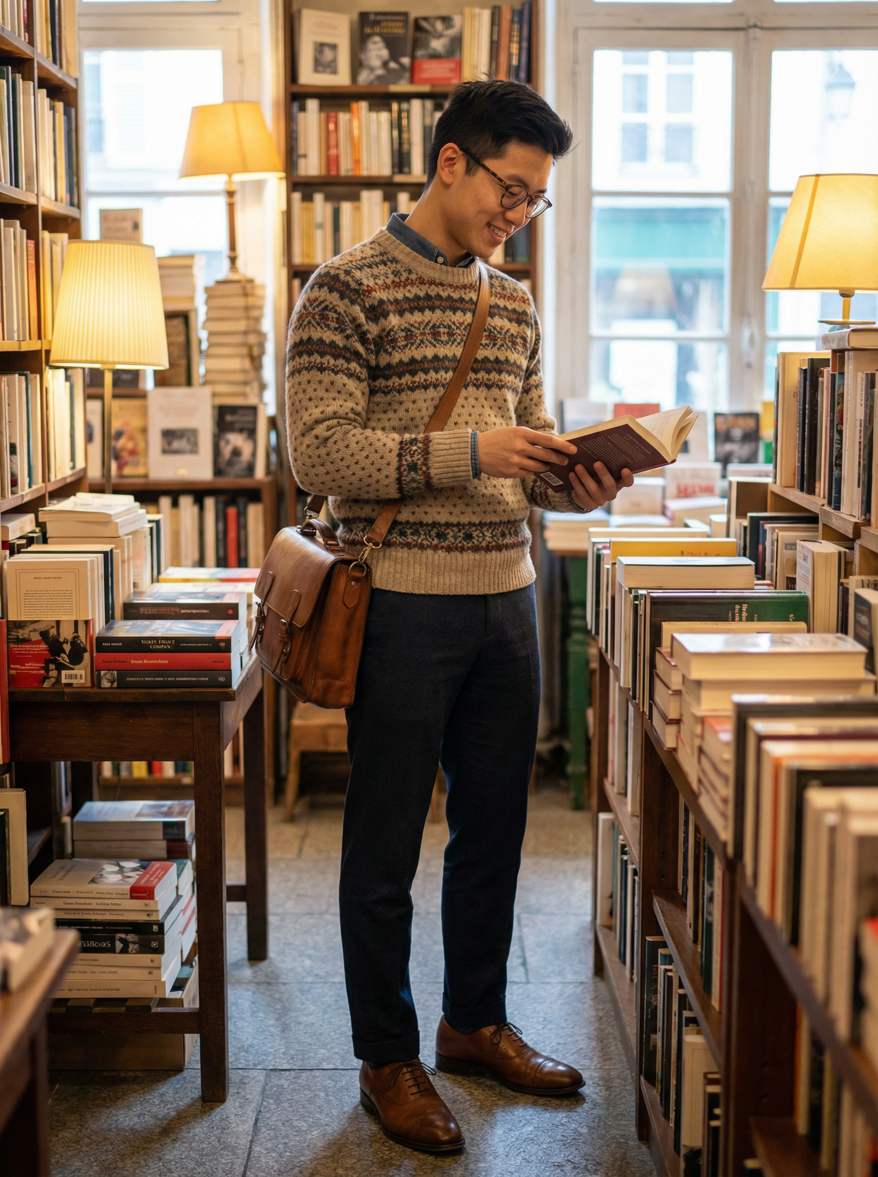 model in vintage sweater, tailored pants, oxford shoes, leather satchel browsing books at Shakespeare and Company bookstore, cozy literary atmosphere, stacked books everywhere, warm indoor lighting, intellectual Parisian charm