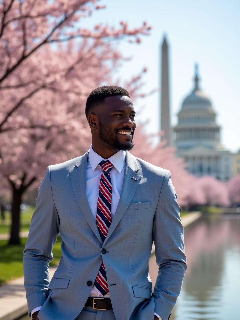 model in Washington DC during cherry blossom season, wearing a light blue suit with a stars and stripes tie, holding a small American flag, the Washington Monument and Capitol building creating a picturesque patriotic backdrop