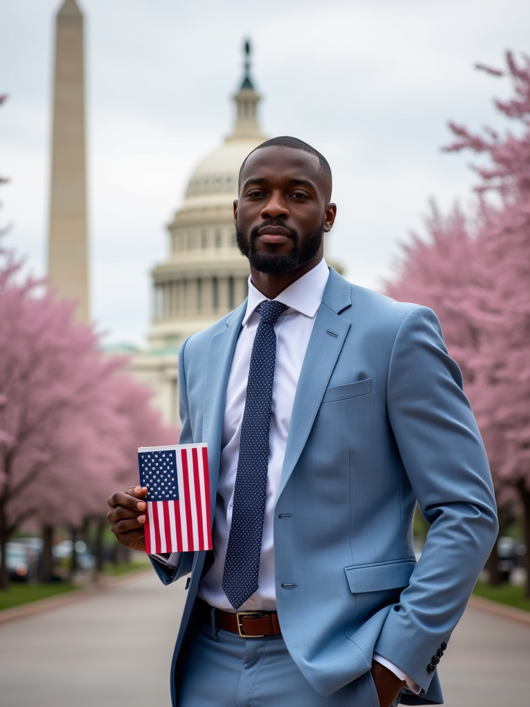 model in Washington DC during cherry blossom season, wearing a light blue suit with a stars and stripes tie, holding a small American flag, the Washington Monument and Capitol building creating a picturesque patriotic backdrop