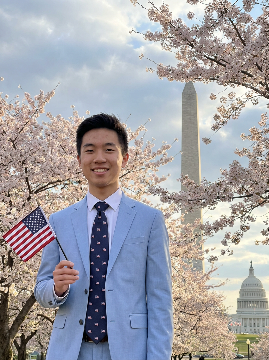 model in Washington DC during cherry blossom season, wearing a light blue suit with a stars and stripes tie, holding a small American flag, the Washington Monument and Capitol building creating a picturesque patriotic backdrop
