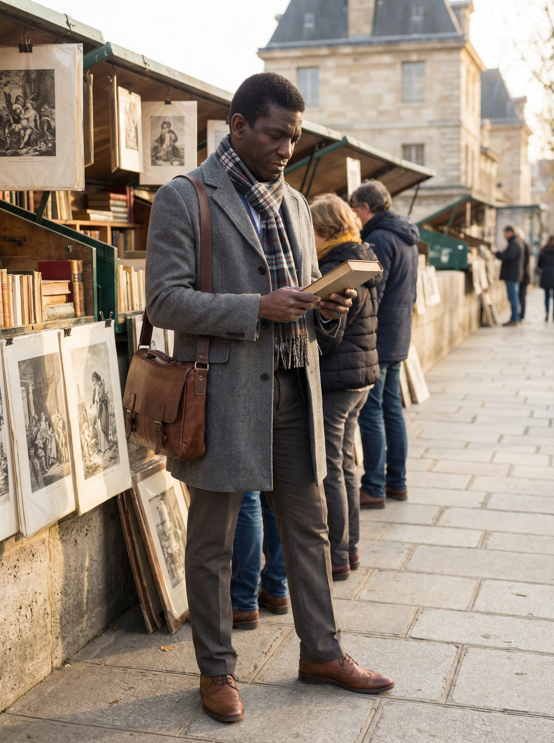 model in wool coat, scarf, dress pants, brogues, messenger bag browsing Latin Quarter used bookstalls along Seine, intellectual atmosphere, old books and prints, academic quarter charm, soft afternoon light, scholarly Parisian culture