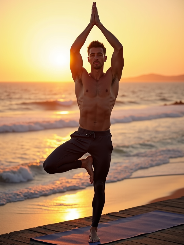 model in workout gear doing sunrise yoga at beachfront deck with ocean panorama