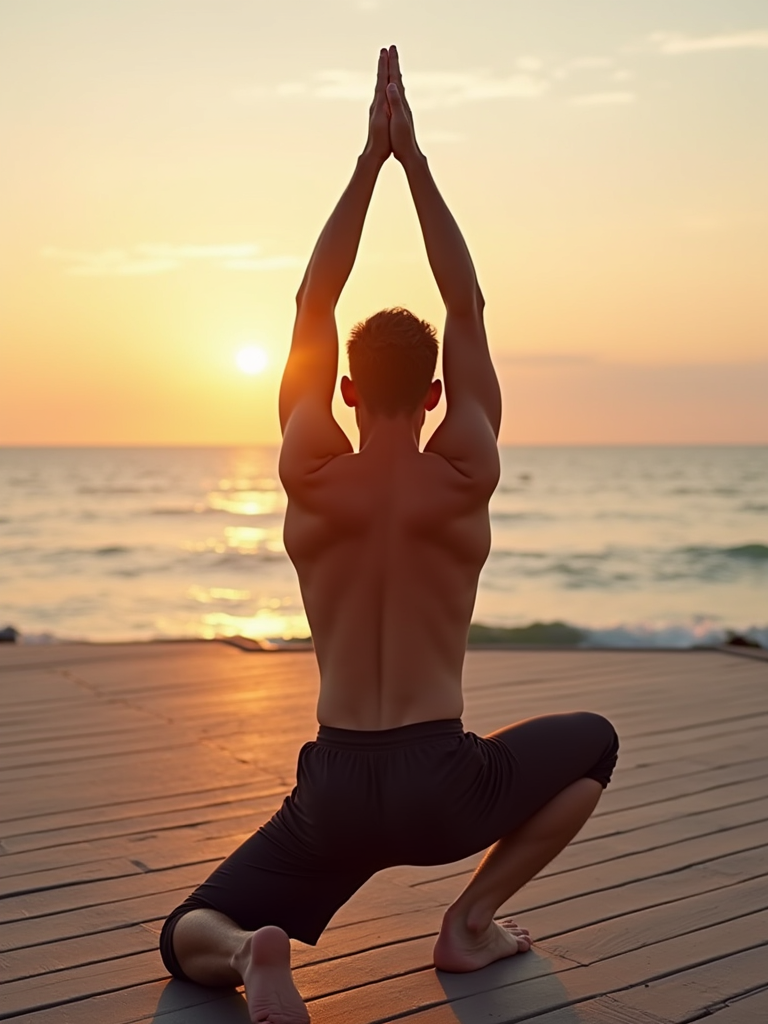 model in workout gear doing sunrise yoga at beachfront deck with ocean panorama