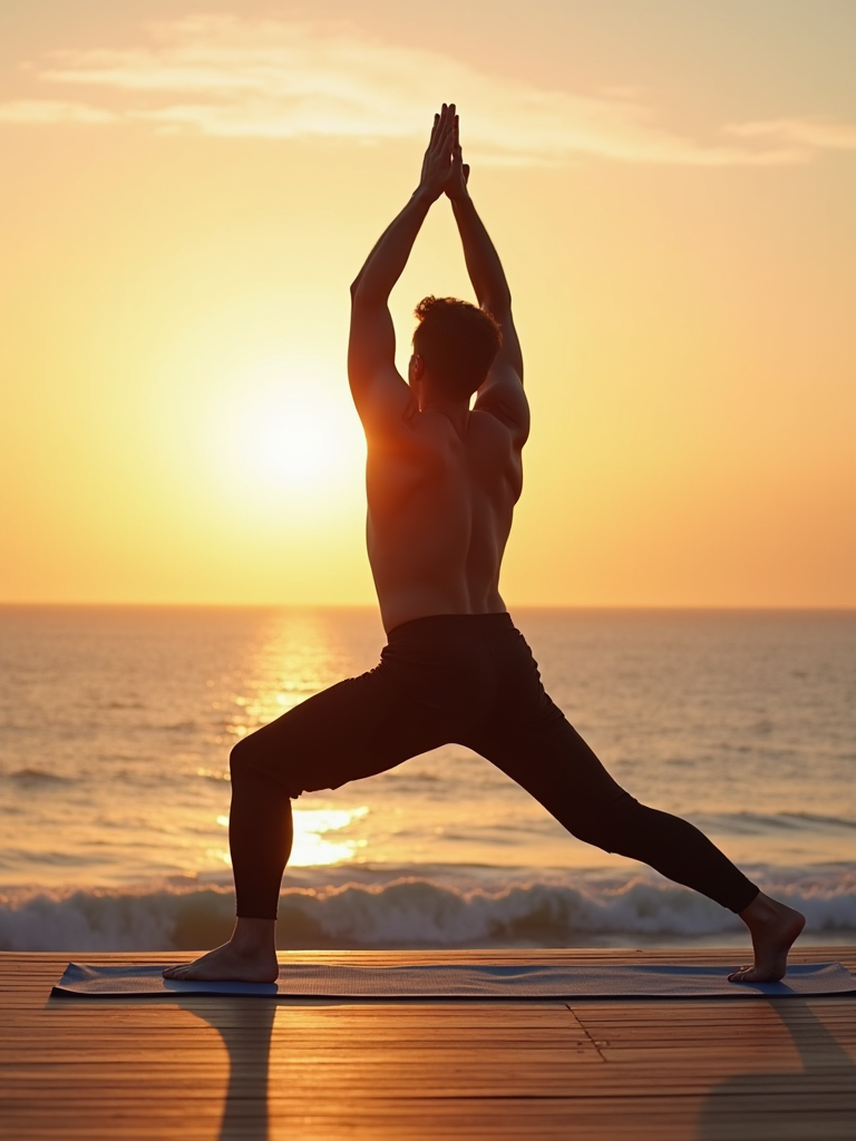 model in workout gear doing sunrise yoga at beachfront deck with ocean panorama
