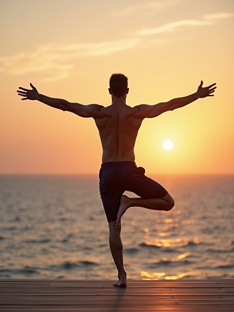 model in workout gear doing sunrise yoga at beachfront deck with ocean panorama