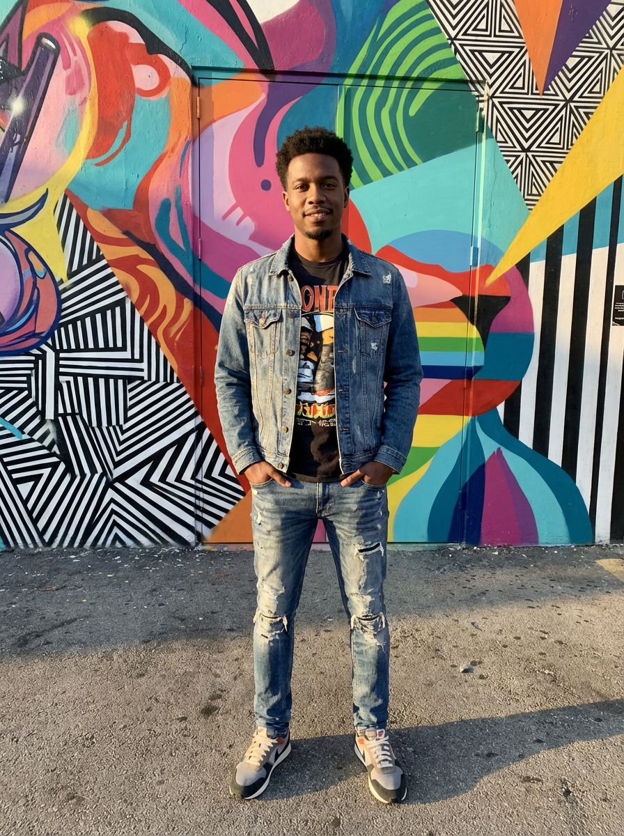model in Wynwood Walls, colorful street art murals, trendy urban outfit, artistic vibe