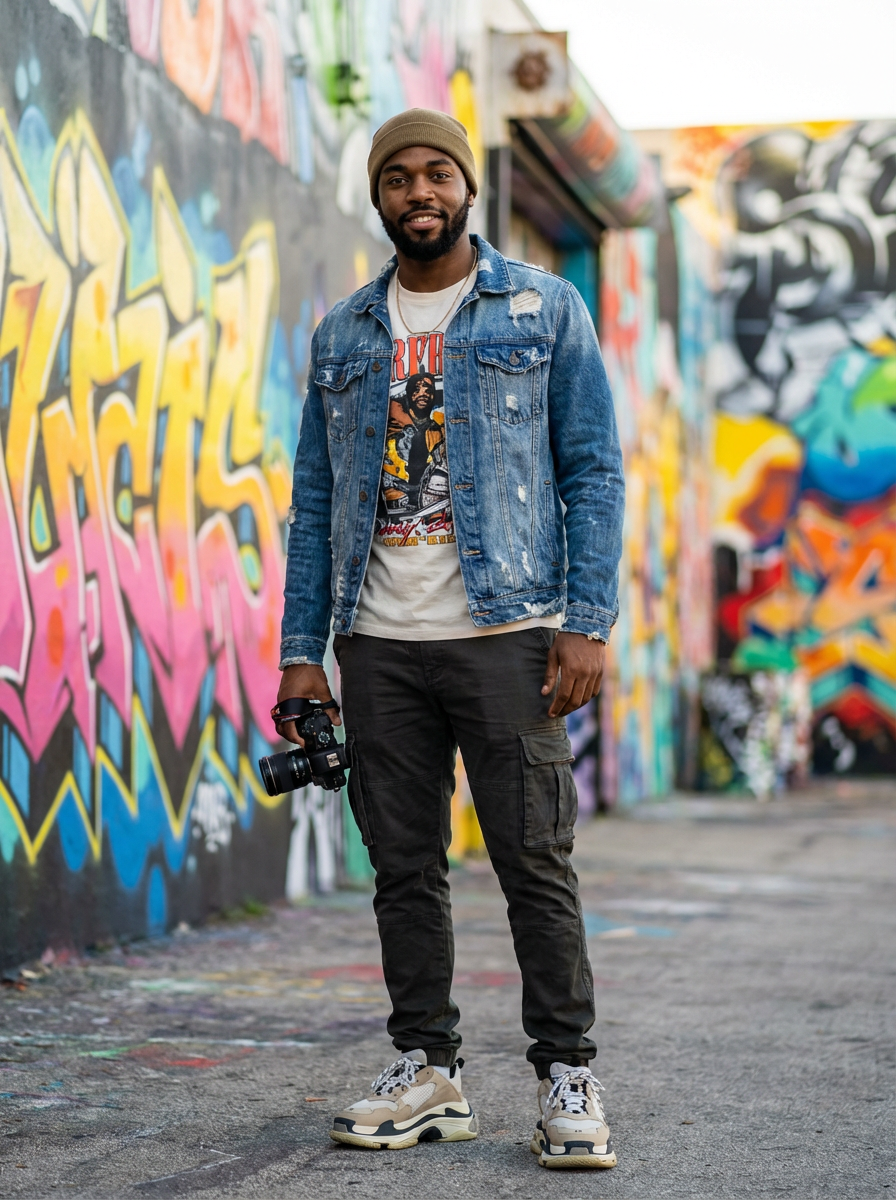 model in Wynwood Walls, colorful street art murals, trendy urban outfit, artistic vibe