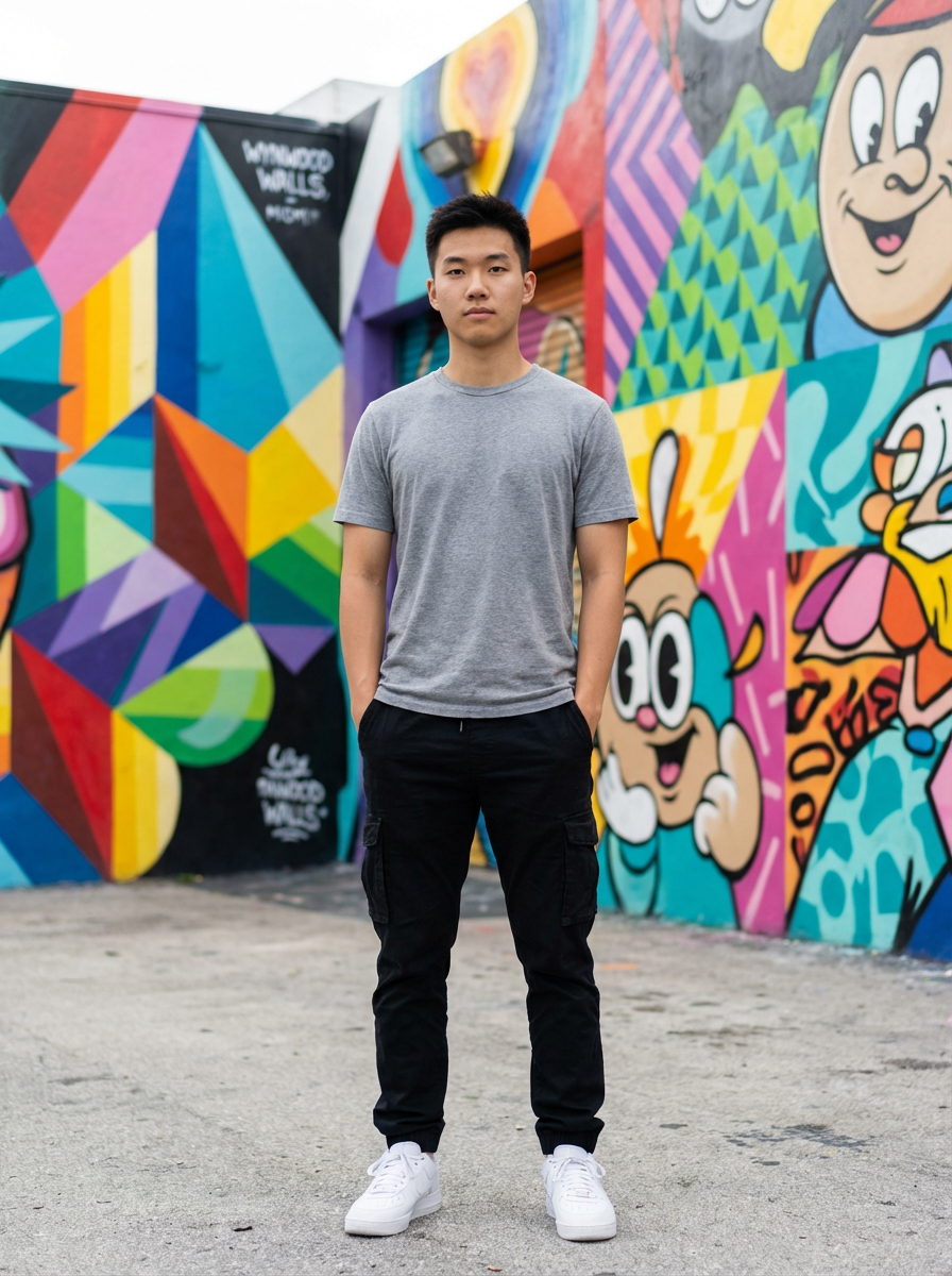 model in Wynwood Walls, colorful street art murals, trendy urban outfit, artistic vibe