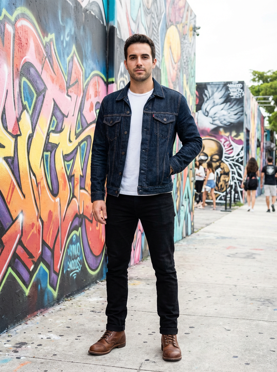 model in Wynwood Walls, colorful street art murals, trendy urban outfit, artistic vibe
