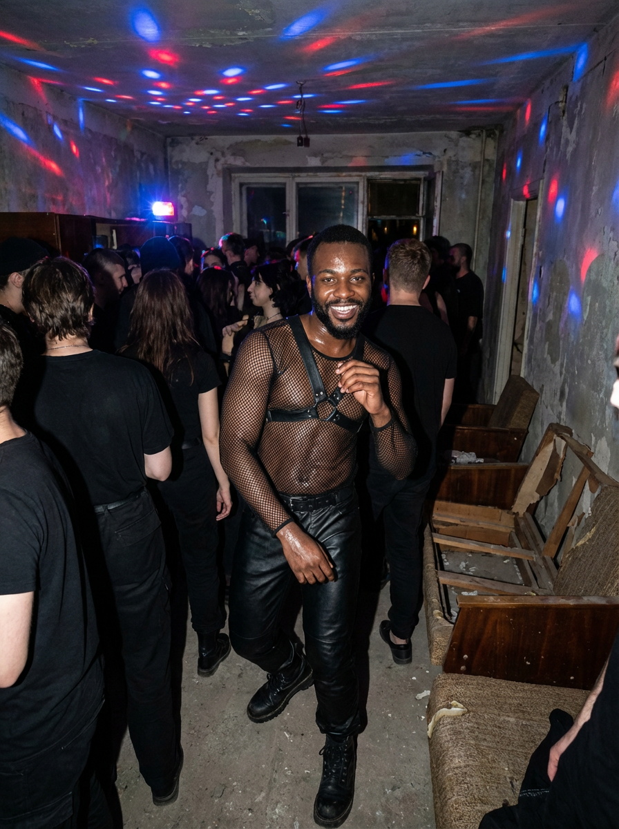 model inside a derelict desolate Soviet-style living room at night with red and blue lights. party full of crowds of people dancing. model wearing black fetish wear. leather pants. fishnet top. . people wear black.