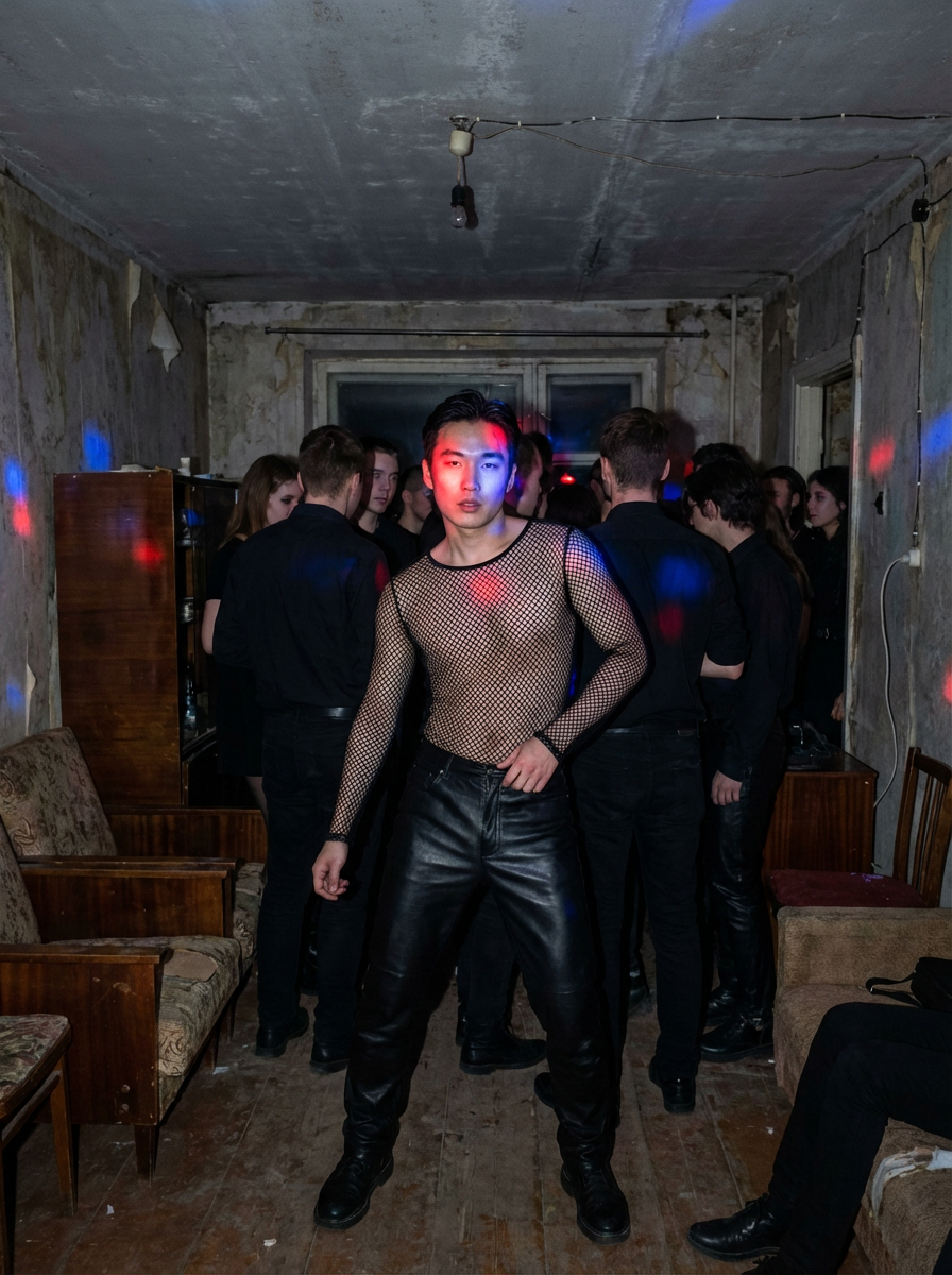 model inside a derelict desolate Soviet-style living room at night with red and blue lights. party full of crowds of people dancing. model wearing black fetish wear. leather pants. fishnet top. . people wear black.