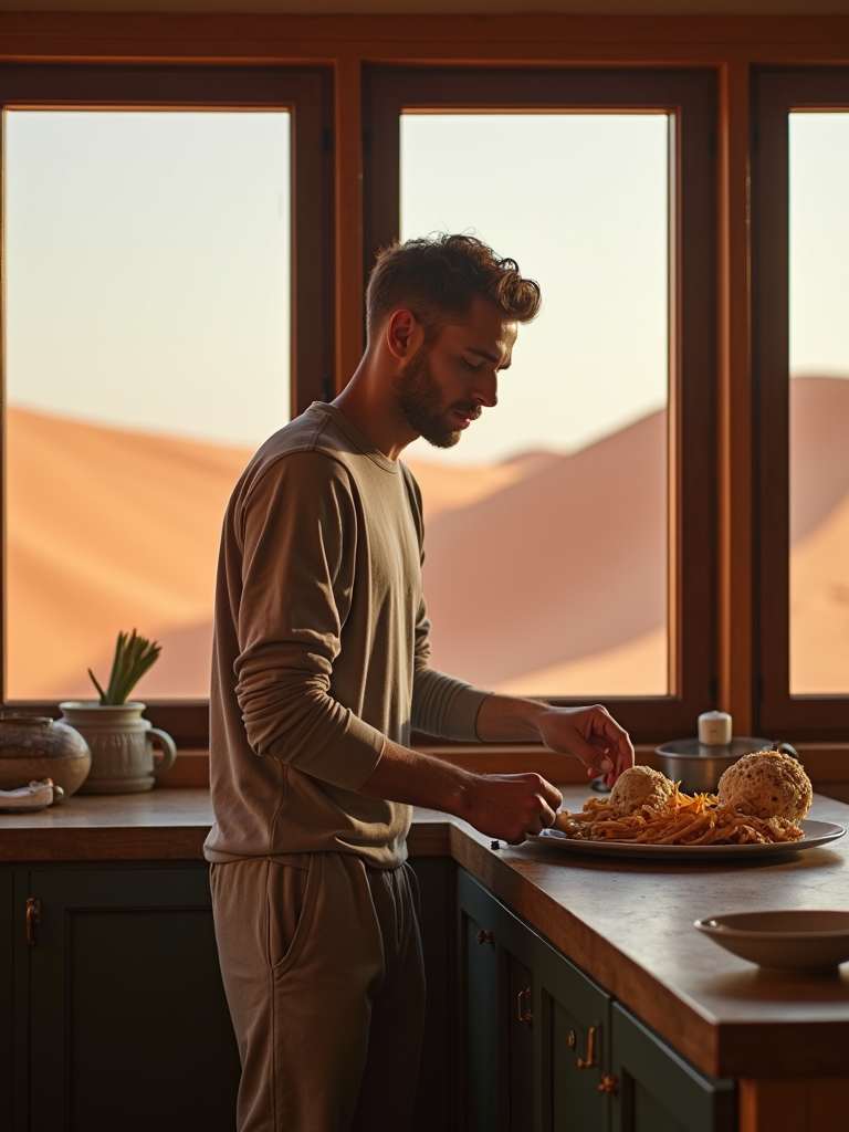 model inside in an indoor kitchen preparing food with Mars red dunes in the big windows. model wears a relaxed long-sleeve shirt and joggers.