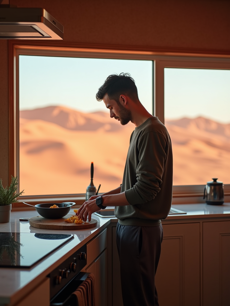 model inside in an indoor kitchen preparing food with Mars red dunes in the big windows. model wears a relaxed long-sleeve shirt and joggers.