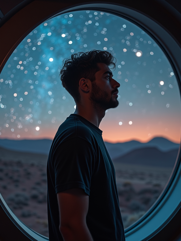 model inside indoor Space Observatory on Mars. only stars visible in ceiling glass at night. model wearing casual clothes.