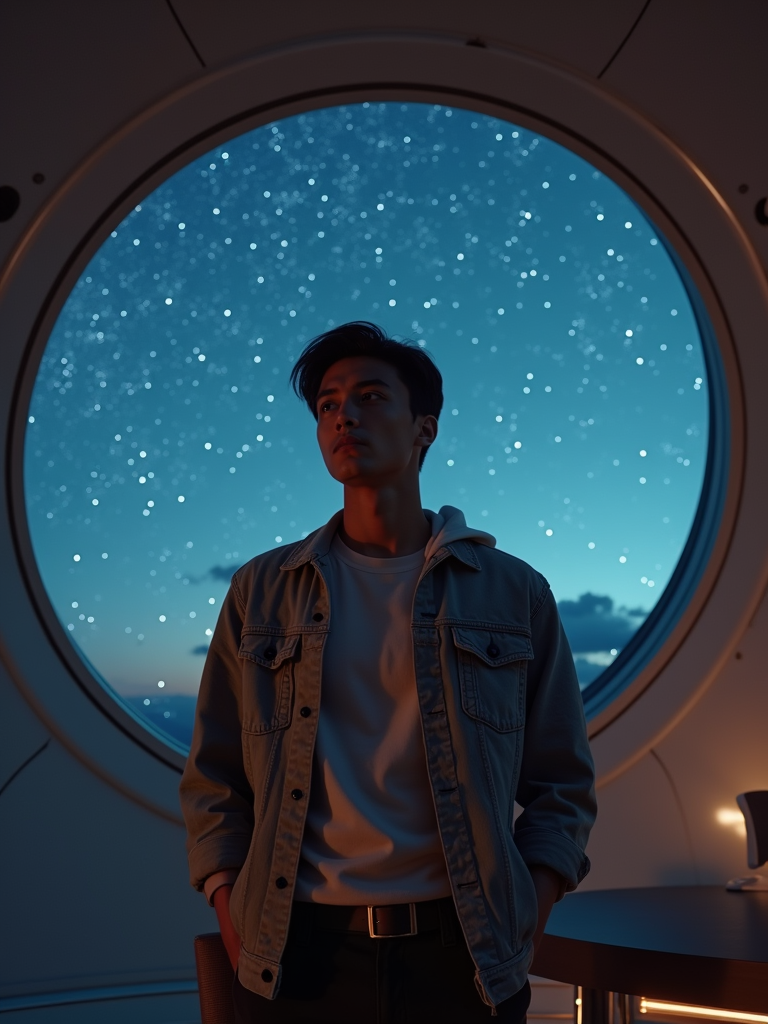 model inside indoor Space Observatory on Mars. only stars visible in ceiling glass at night. model wearing casual clothes.