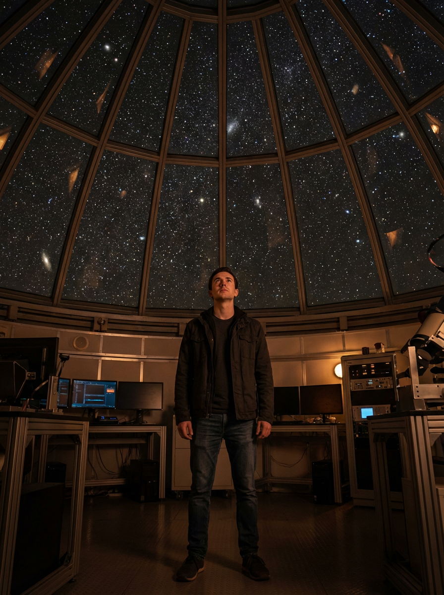 model inside indoor Space Observatory on Mars. only stars visible in ceiling glass at night. model wearing casual clothes.