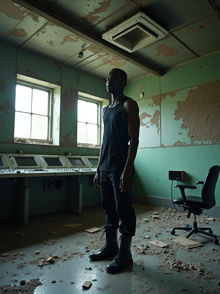 model inside the chernobyl nuclear reactor control room, standing among broken panels, shattered screens switched off. natural light from outside. wearing black boots and black pants and black tank top.