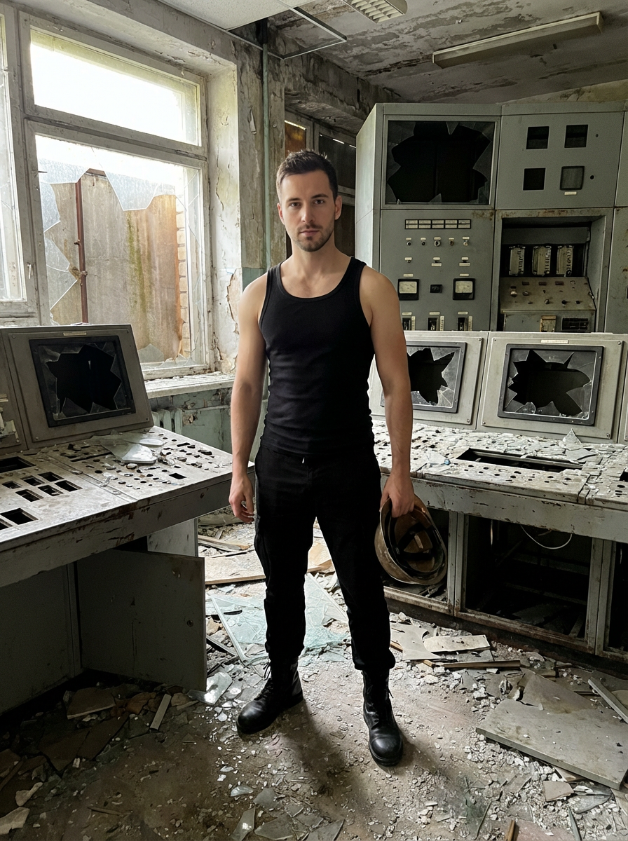 model inside the chernobyl nuclear reactor control room, standing among broken panels, shattered screens switched off. natural light from outside. wearing black boots and black pants and black tank top.