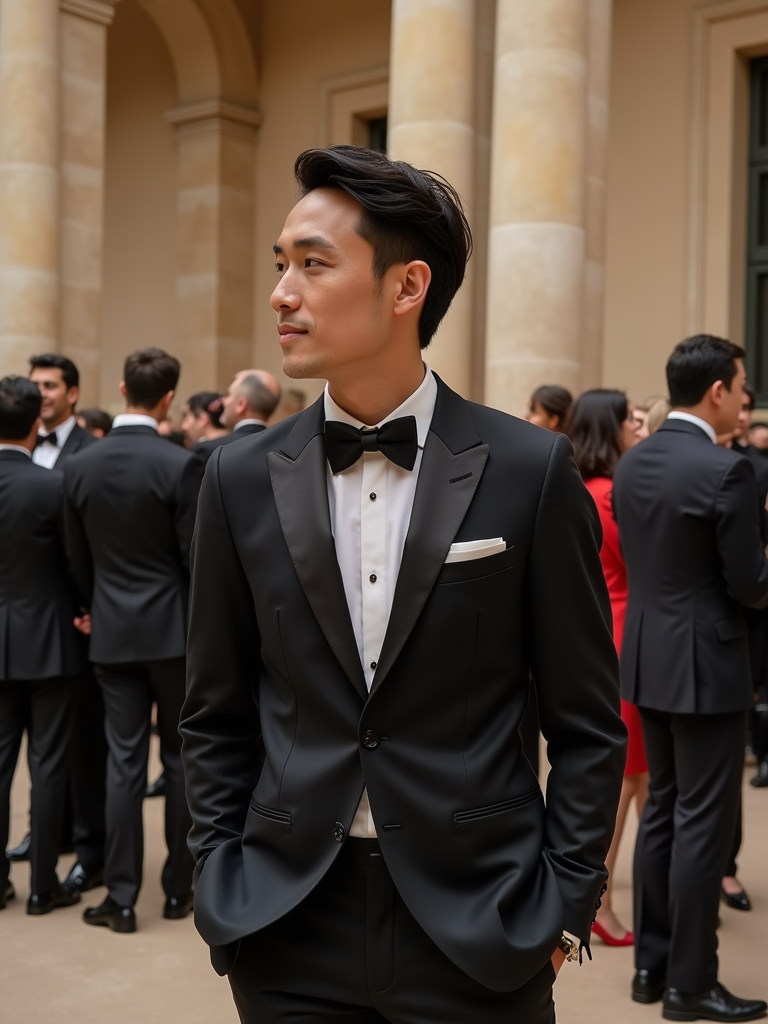 model interacting with famous fashion designers in the Met's European sculpture court, wearing a bespoke suit demonstrating sartorial excellence, museum space transformed with gala decorations