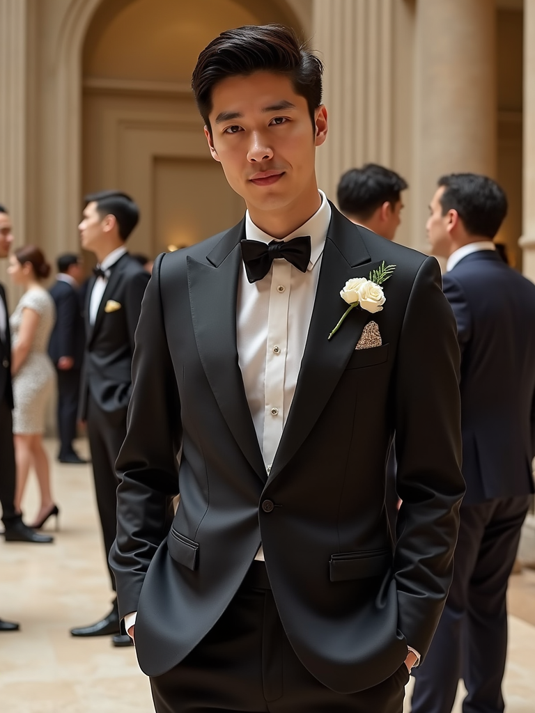 model interacting with famous fashion designers in the Met's European sculpture court, wearing a bespoke suit demonstrating sartorial excellence, museum space transformed with gala decorations
