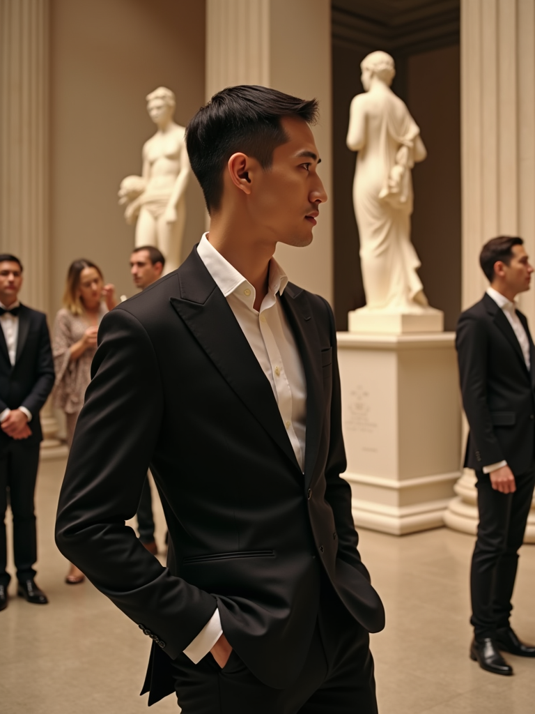 model interacting with famous fashion designers in the Met's European sculpture court, wearing a bespoke suit demonstrating sartorial excellence, museum space transformed with gala decorations