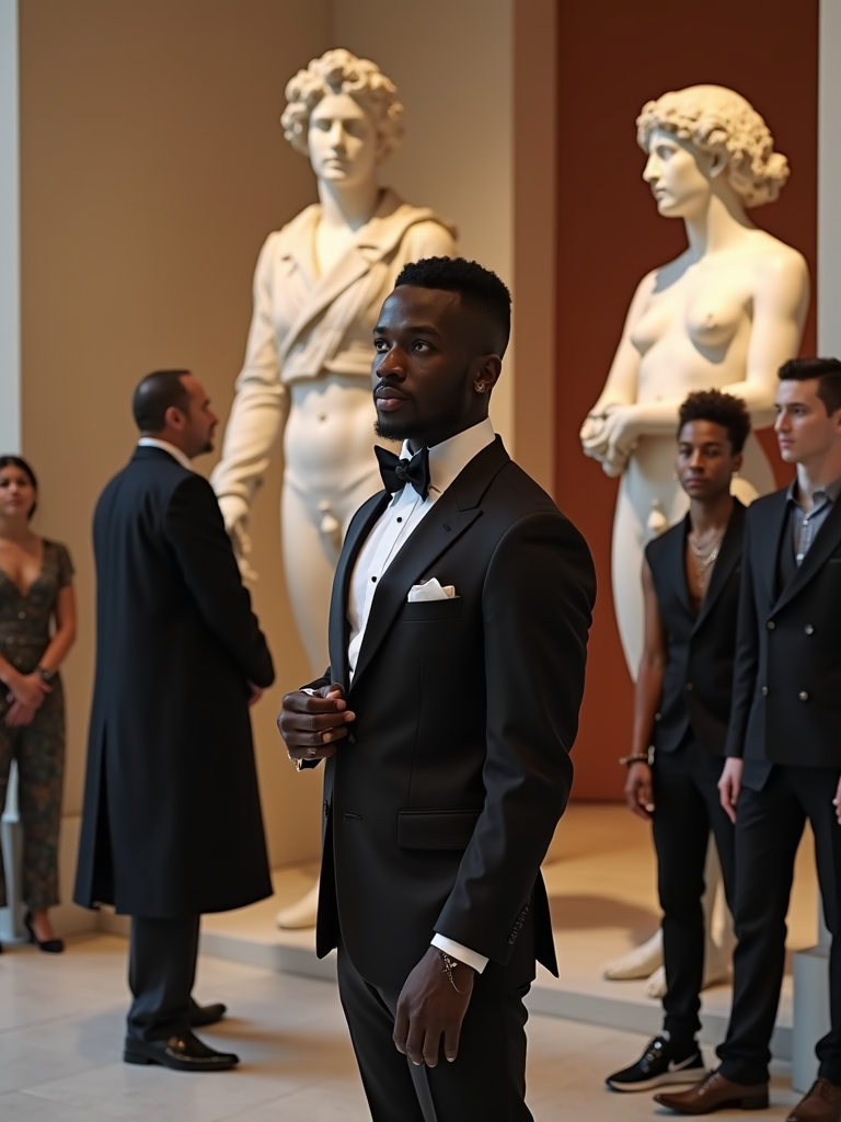 model interacting with famous fashion designers in the Met's European sculpture court, wearing a bespoke suit demonstrating sartorial excellence, museum space transformed with gala decorations