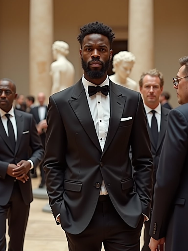 model interacting with famous fashion designers in the Met's European sculpture court, wearing a bespoke suit demonstrating sartorial excellence, museum space transformed with gala decorations