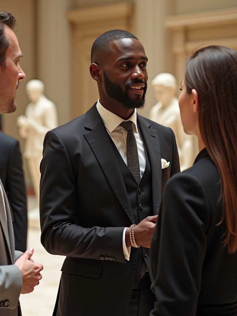 model interacting with famous fashion designers in the Met's European sculpture court, wearing a bespoke suit demonstrating sartorial excellence, museum space transformed with gala decorations