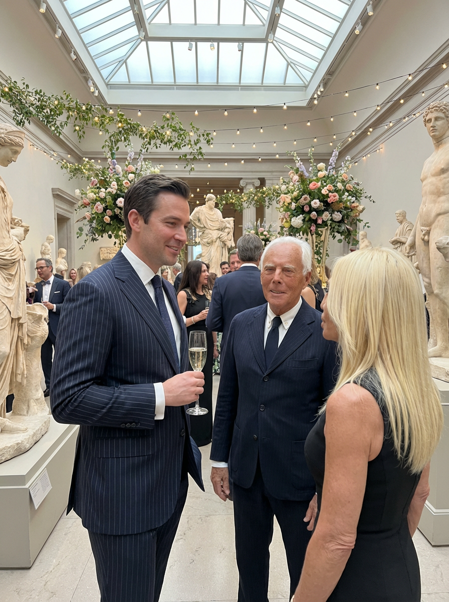 model interacting with famous fashion designers in the Met's European sculpture court, wearing a bespoke suit demonstrating sartorial excellence, museum space transformed with gala decorations