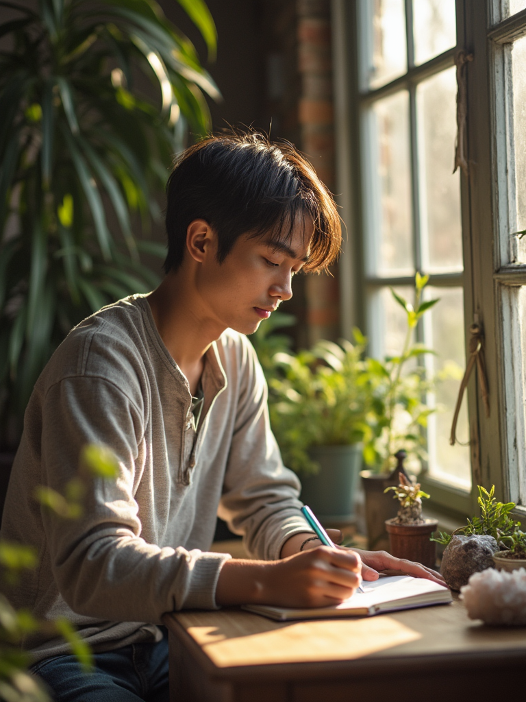 model journaling by window, wearing soft henley shirt, vintage journal and pen, plants and crystals nearby, warm afternoon light, mindful moment