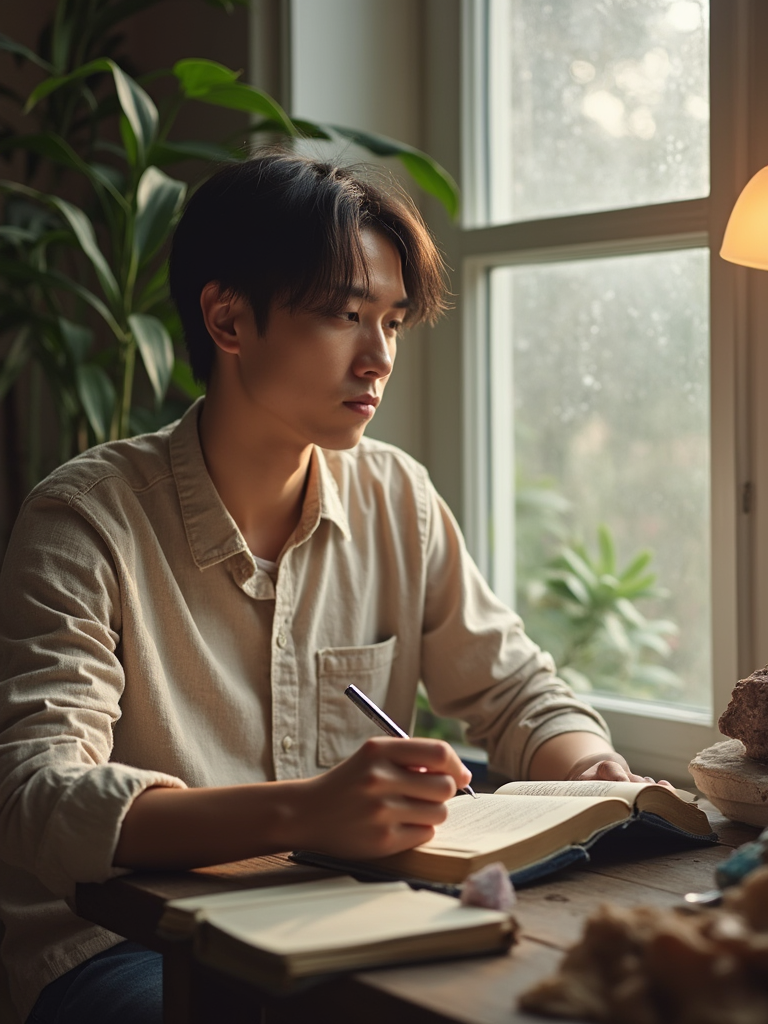 model journaling by window, wearing soft henley shirt, vintage journal and pen, plants and crystals nearby, warm afternoon light, mindful moment