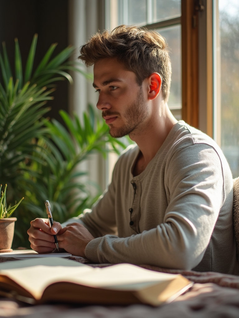 model journaling by window, wearing soft henley shirt, vintage journal and pen, plants and crystals nearby, warm afternoon light, mindful moment