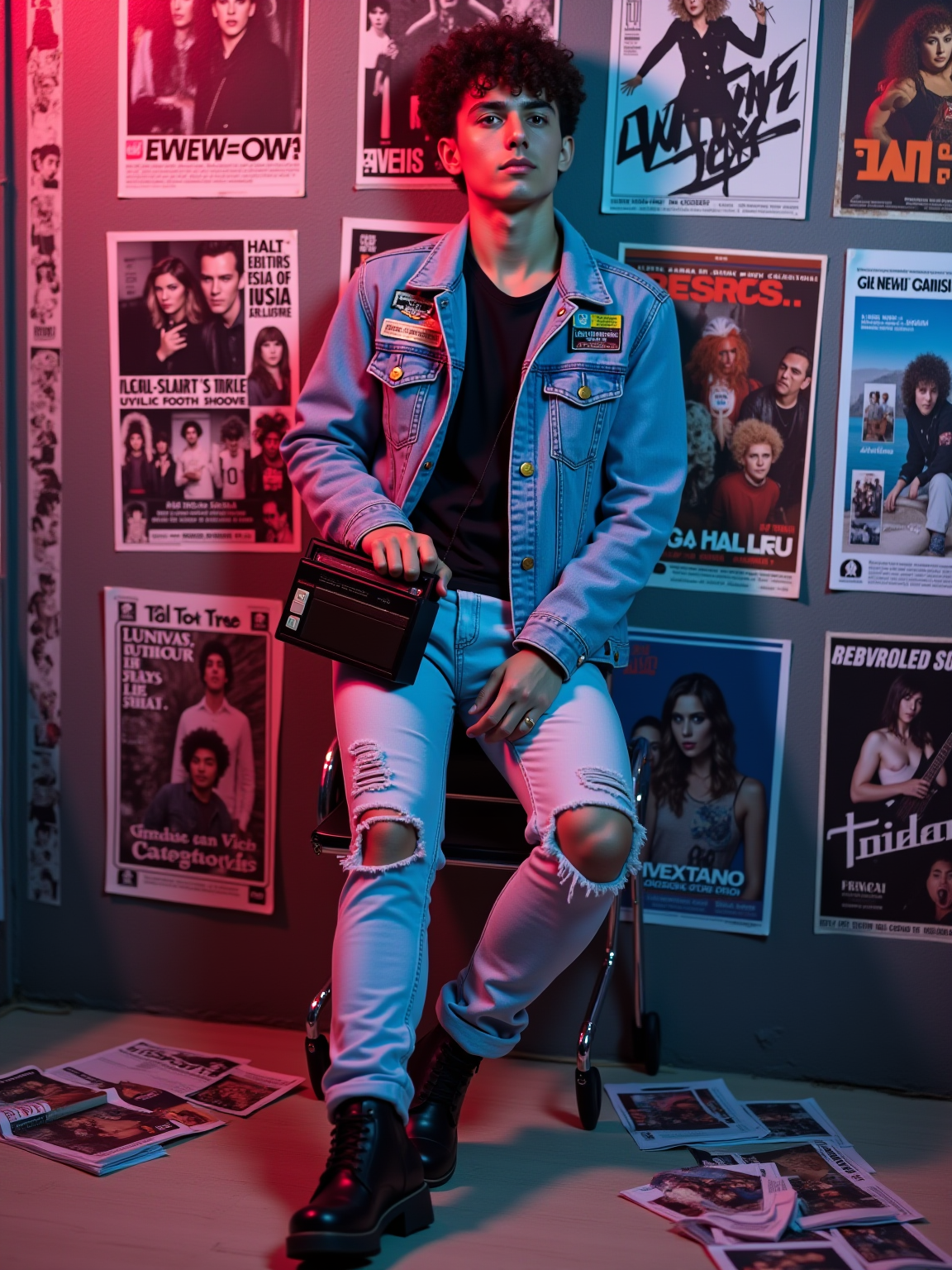 model leaning against a wall covered in 80s movie posters, wearing denim jacket with band patches and ripped jeans, holding a portable radio with antenna extended, scattered music magazines on the floor, pink and blue neon lighting creating retro atmosphere