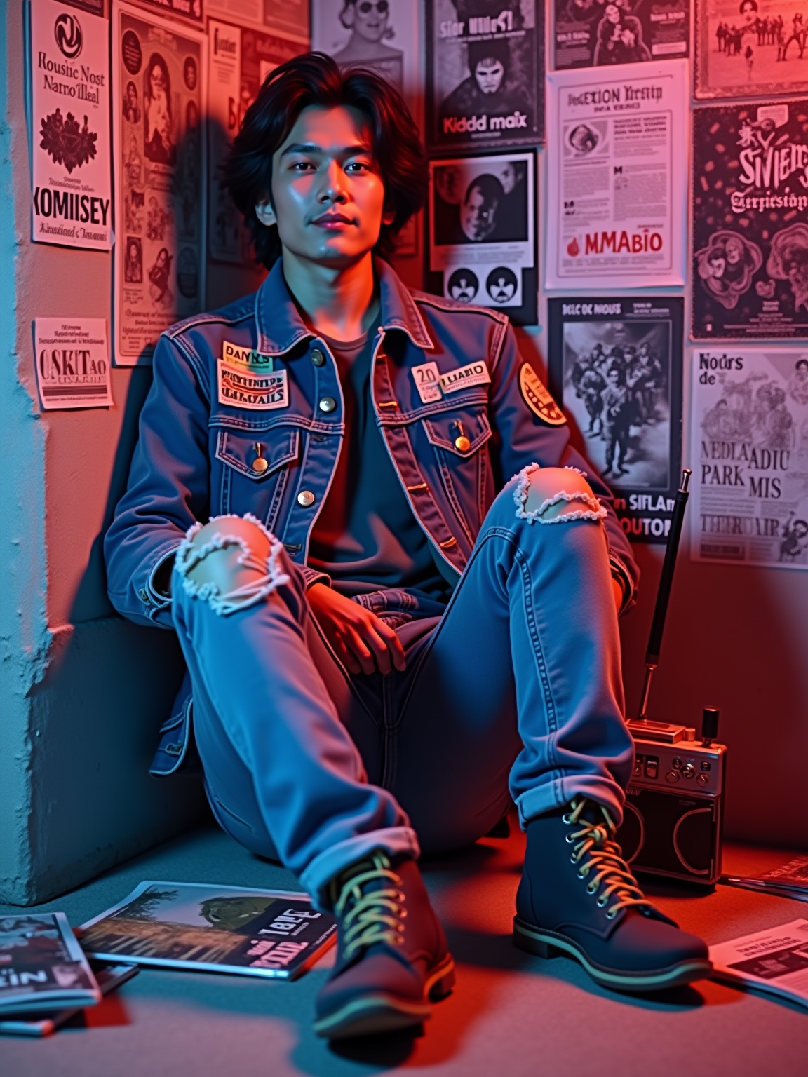 model leaning against a wall covered in 80s movie posters, wearing denim jacket with band patches and ripped jeans, holding a portable radio with antenna extended, scattered music magazines on the floor, pink and blue neon lighting creating retro atmosphere
