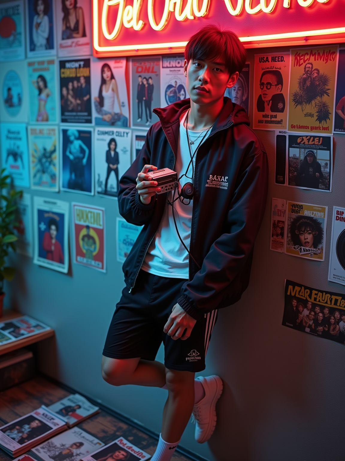 model leaning against a wall covered in 90s band posters, wearing a windbreaker jacket and athletic shorts, holding a Walkman with tangled headphone wires, scattered music magazines on the floor, neon lighting creating a nostalgic glow