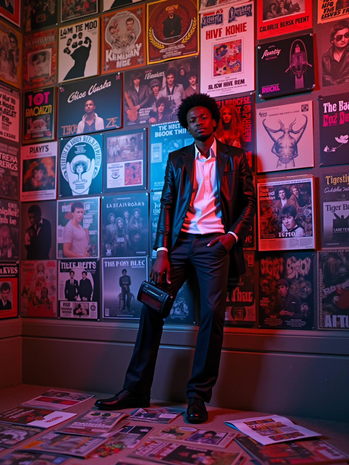 model leaning against a wall covered in concert posters and album artwork, wearing a collarless Beatles-style jacket over a white shirt, holding a portable AM radio, scattered 16 Magazine and Tiger Beat publications on the floor, blacklight posters glowing under colored bulbs
