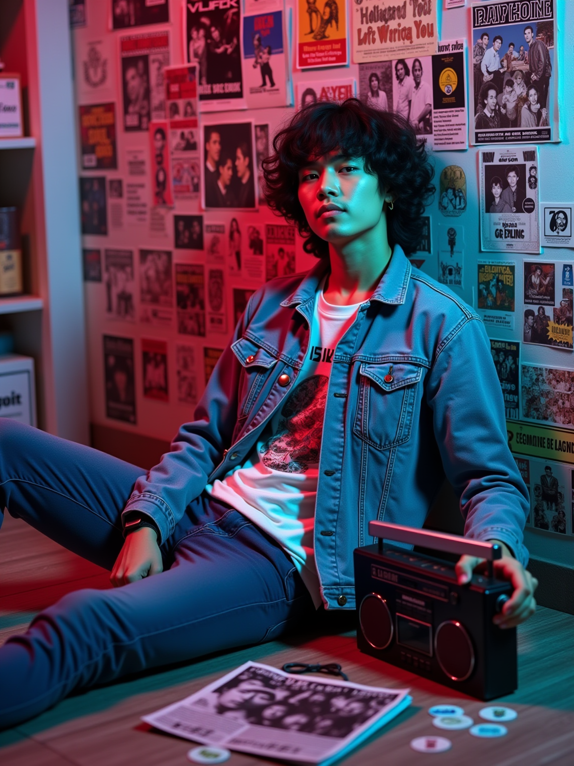 model leaning against a wall covered in concert posters and album covers, wearing a denim jacket with patches over a band t-shirt, holding a transistor radio with telescoping antenna, scattered Rolling Stone magazines on the floor, psychedelic blacklight posters glowing under colored lighting