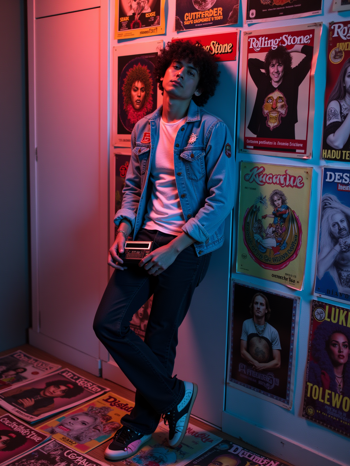 model leaning against a wall covered in concert posters and album covers, wearing a denim jacket with patches over a band t-shirt, holding a transistor radio with telescoping antenna, scattered Rolling Stone magazines on the floor, psychedelic blacklight posters glowing under colored lighting