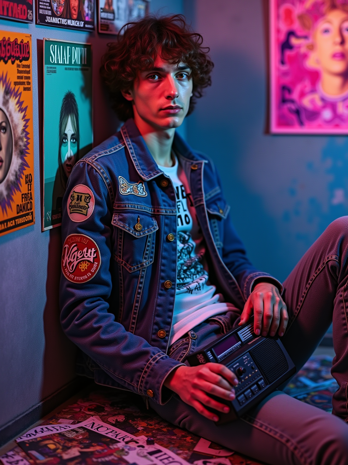 model leaning against a wall covered in concert posters and album covers, wearing a denim jacket with patches over a band t-shirt, holding a transistor radio with telescoping antenna, scattered Rolling Stone magazines on the floor, psychedelic blacklight posters glowing under colored lighting