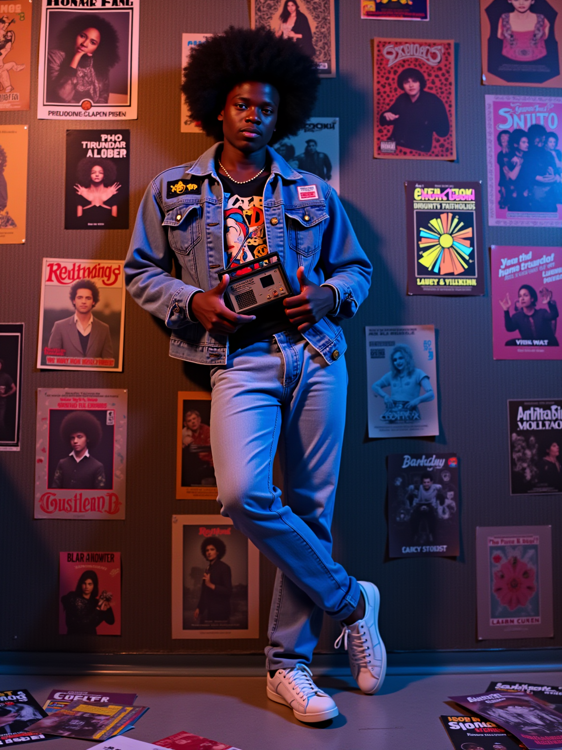model leaning against a wall covered in concert posters and album covers, wearing a denim jacket with patches over a band t-shirt, holding a transistor radio with telescoping antenna, scattered Rolling Stone magazines on the floor, psychedelic blacklight posters glowing under colored lighting