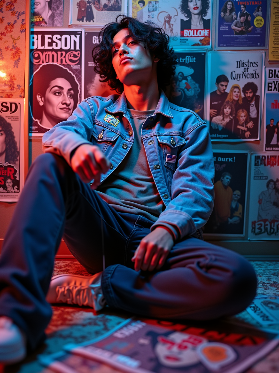 model leaning against a wall covered in concert posters and album covers, wearing a denim jacket with patches over a band t-shirt, holding a transistor radio with telescoping antenna, scattered Rolling Stone magazines on the floor, psychedelic blacklight posters glowing under colored lighting