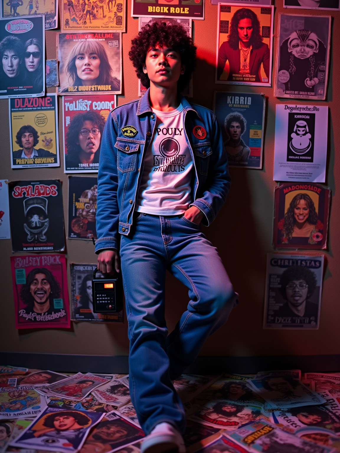 model leaning against a wall covered in concert posters and album covers, wearing a denim jacket with patches over a band t-shirt, holding a transistor radio with telescoping antenna, scattered Rolling Stone magazines on the floor, psychedelic blacklight posters glowing under colored lighting