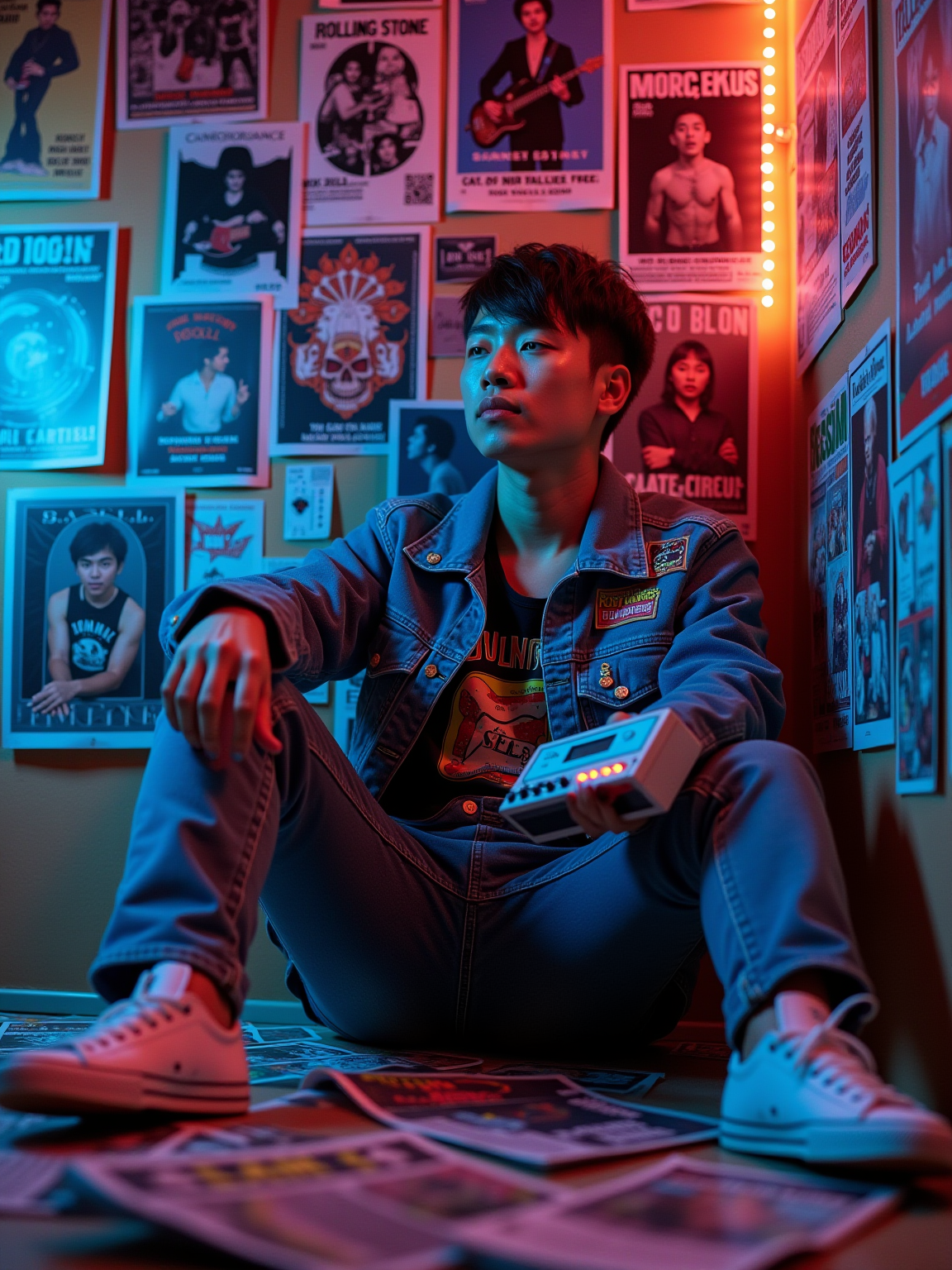 model leaning against a wall covered in concert posters and album covers, wearing a denim jacket with patches over a band t-shirt, holding a transistor radio with telescoping antenna, scattered Rolling Stone magazines on the floor, psychedelic blacklight posters glowing under colored lighting