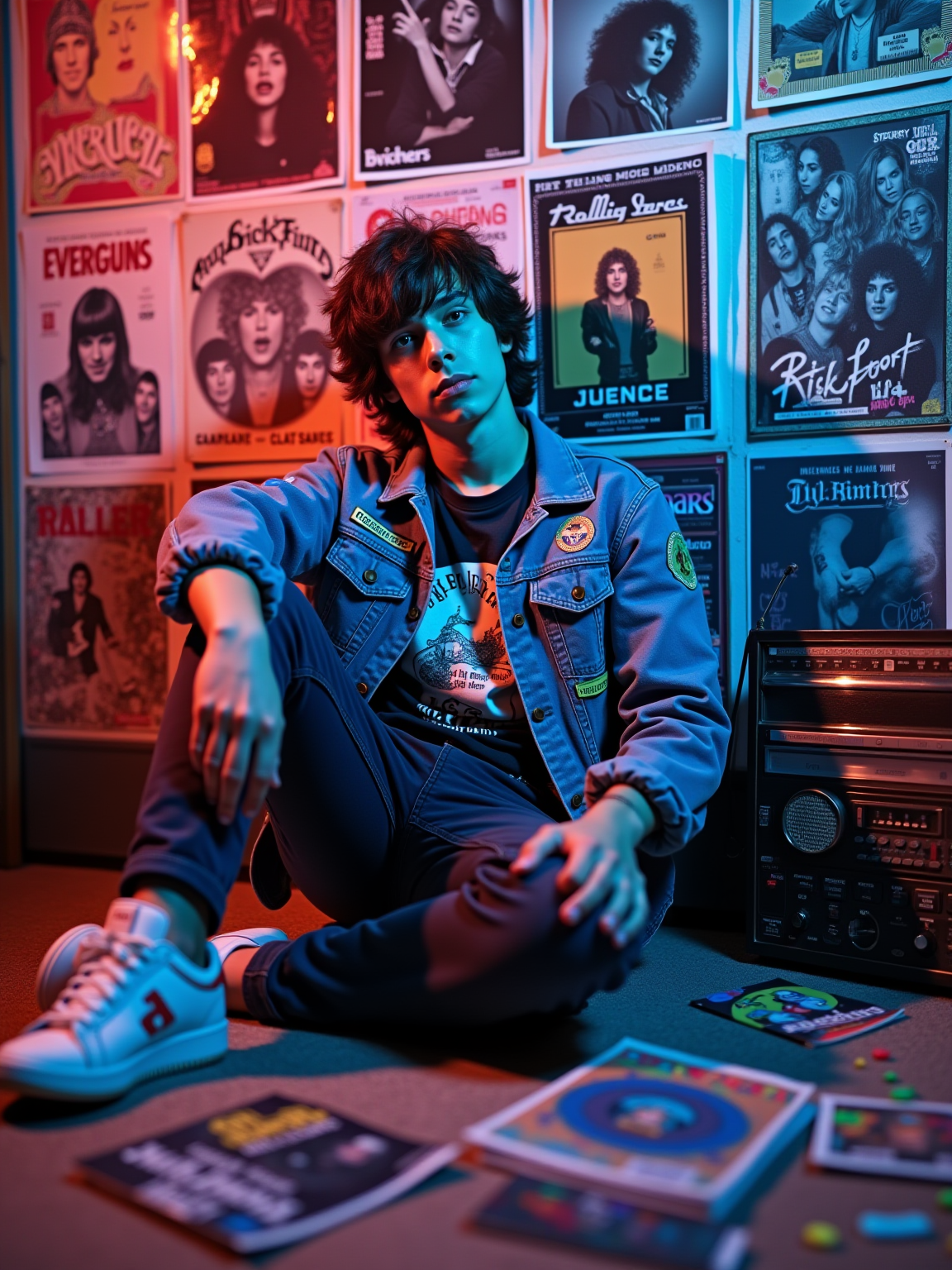 model leaning against a wall covered in concert posters and album covers, wearing a denim jacket with patches over a band t-shirt, holding a transistor radio with telescoping antenna, scattered Rolling Stone magazines on the floor, psychedelic blacklight posters glowing under colored lighting