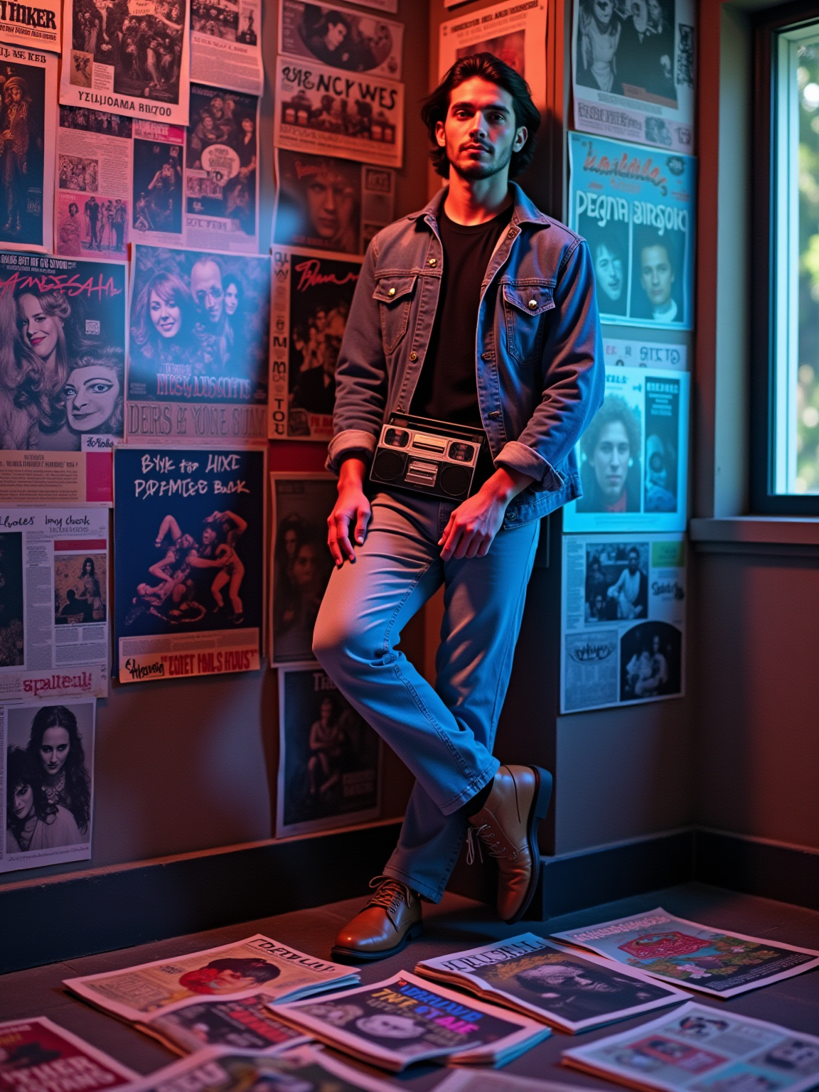 model leaning against a wall covered in concert posters and album covers, wearing a denim jacket with patches over a band t-shirt, holding a transistor radio with telescoping antenna, scattered Rolling Stone magazines on the floor, psychedelic blacklight posters glowing under colored lighting