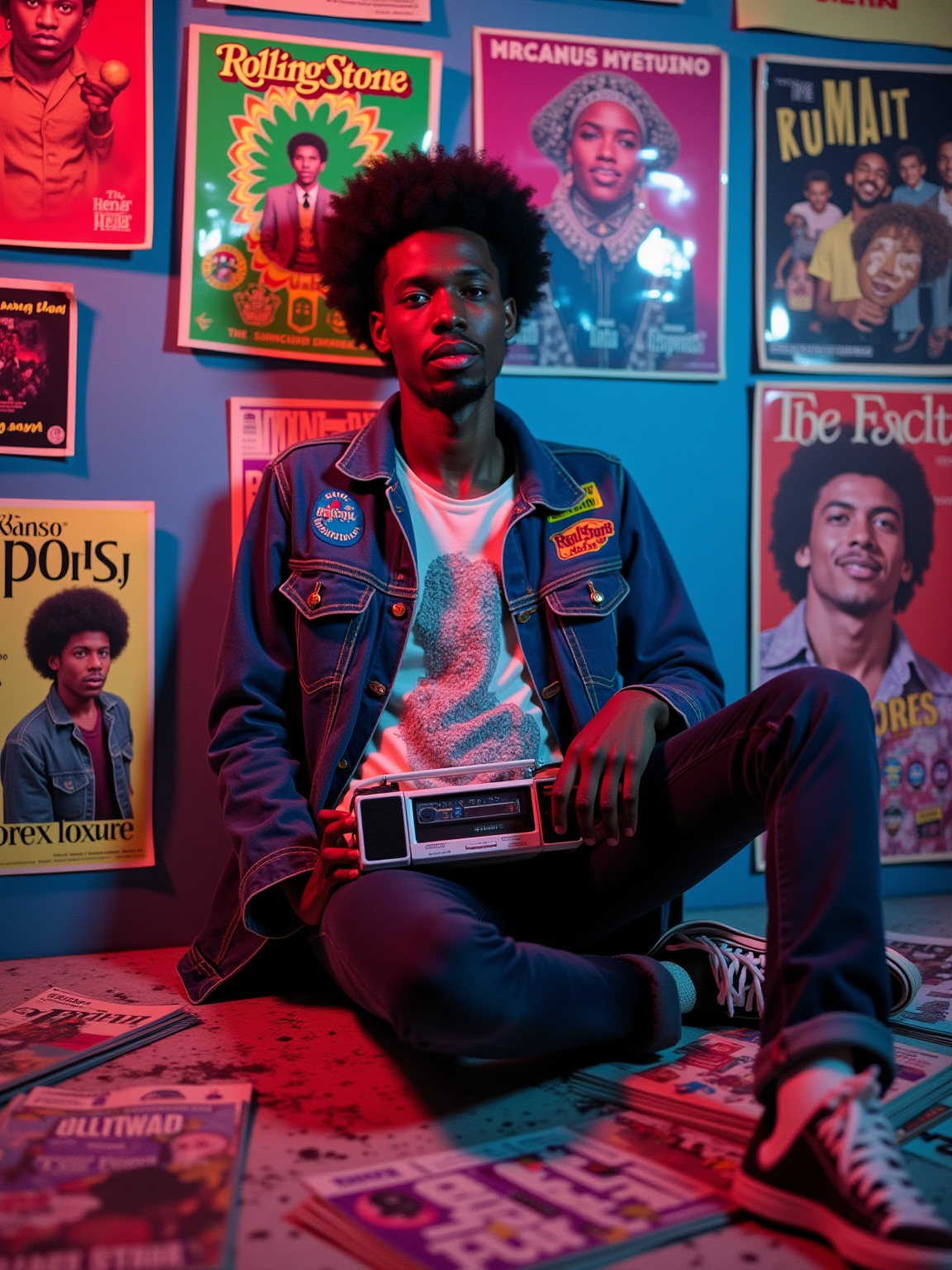 model leaning against a wall covered in concert posters and album covers, wearing a denim jacket with patches over a band t-shirt, holding a transistor radio with telescoping antenna, scattered Rolling Stone magazines on the floor, psychedelic blacklight posters glowing under colored lighting