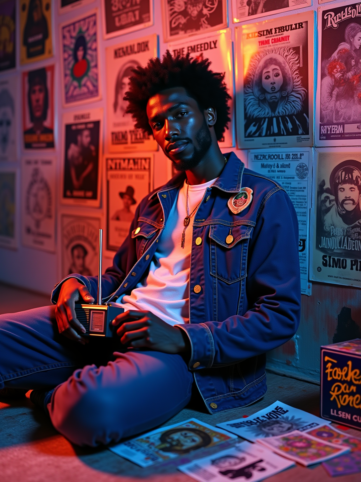 model leaning against a wall covered in concert posters and album covers, wearing a denim jacket with patches over a band t-shirt, holding a transistor radio with telescoping antenna, scattered Rolling Stone magazines on the floor, psychedelic blacklight posters glowing under colored lighting