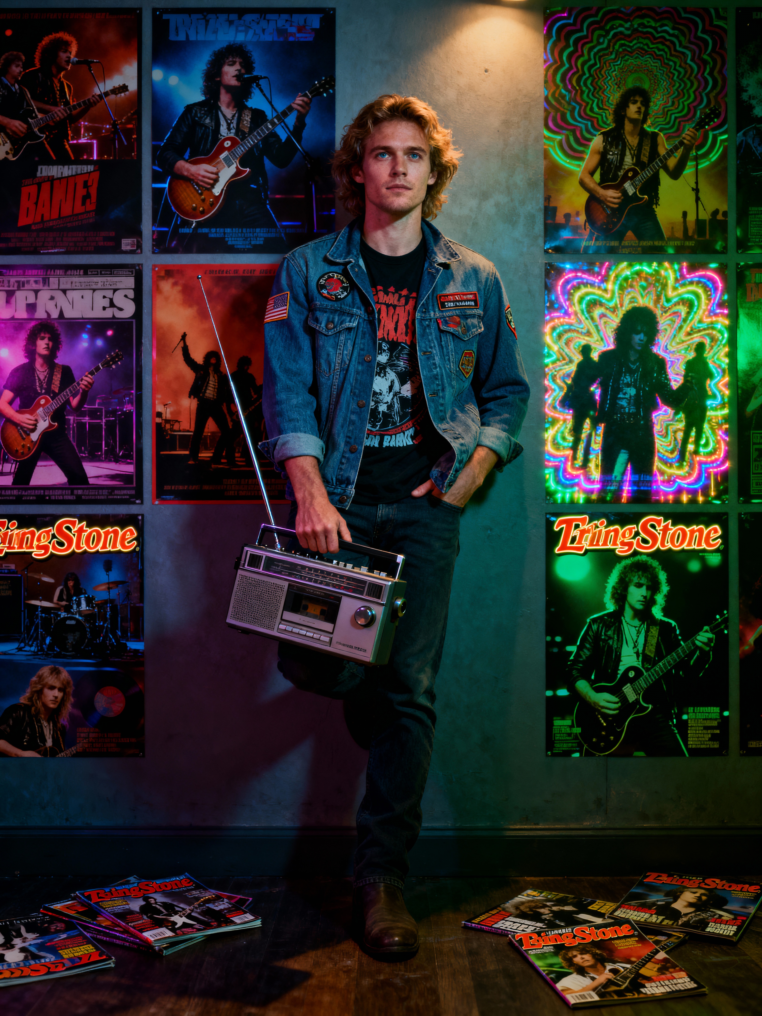 model leaning against a wall covered in concert posters and album covers, wearing a denim jacket with patches over a band t-shirt, holding a transistor radio with telescoping antenna, scattered Rolling Stone magazines on the floor, psychedelic blacklight posters glowing under colored lighting